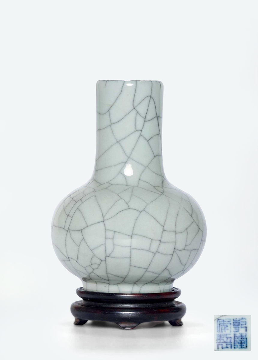 此瓶取法宋官窯經典形制,斂口微侈,長頸豐肩,腹部圓鼓如寶葫蘆,至底漸收成圈足,線條凝練流暢,比例精妙合度。瓶身施仿官釉,釉色取法北宋官窯“粉青”基調,卻更顯清透溫潤——釉層肥厚如凝脂,釉面泛著柔和的天青光澤,近觀可見細微開片如冰裂交織,大紋套小紋,呈“金絲鐵線”之妙,通高雖僅盈尺,卻於小巧中見端莊,盡顯文人案頭清供的雅逸之趣。