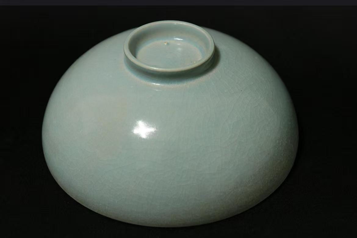 此器為宋代汝窯燒制的瓷碗,汝窯乃宋代“五大名窯”(汝、官、哥、鈞、定)之首,憑“釉色天青如空、開片冰裂似玉、胎質薄堅若瓷”冠絕古今。此件汝窯碗作敞口、弧腹、圈足之經典形制,線條婉轉流暢,器型端莊素淨。通體施天青釉,色澤取法自然——“雨過天青雲破處,這般顏色做將來”(傳說宋徽宗對汝窯釉色的禦批)。釉色澄澈空蒙,如春日晴空初霽,又似秋水凝波漾光;釉層勻淨瑩潤,似凝脂裹器,觸手柔滑若酥;釉面或有細微開片如“蟬翼紋”細密精巧,胎呈香灰色,質地細膩堅致,胎體輕薄卻韌性十足。汝窯存世器物極罕,加之宋代“文官治國”背景下,汝窯作為宮廷用瓷的“禮制屬性”,令此碗不僅是工藝傑作,更是宋代美學、哲學與權力秩序的物質載體。