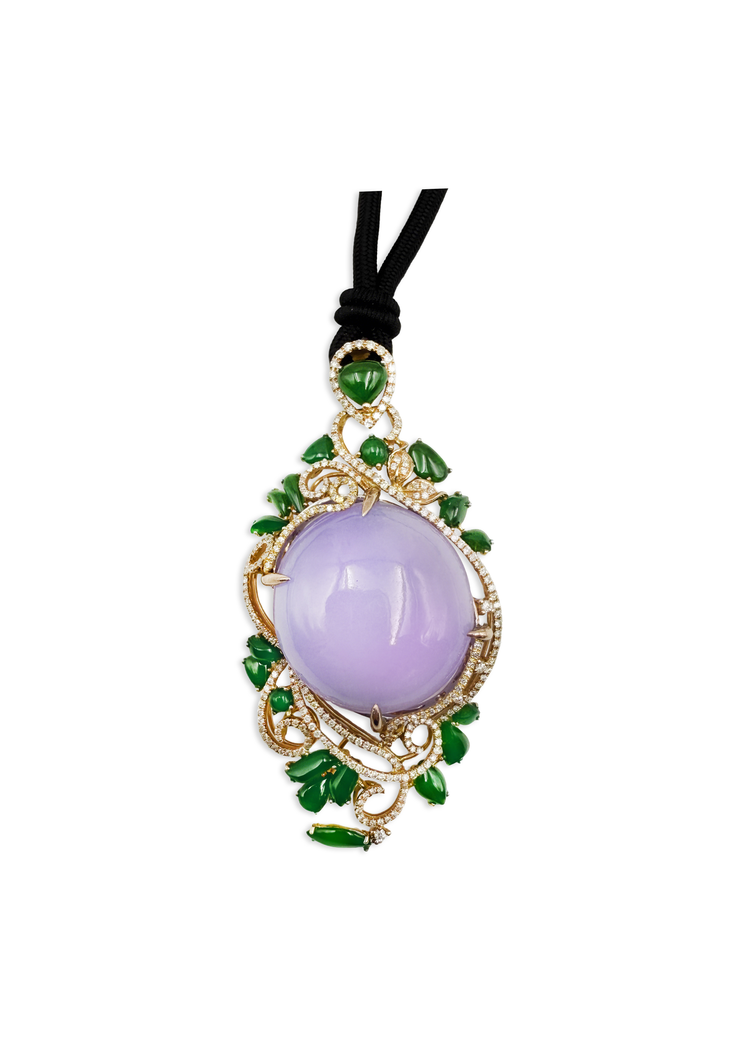 其主體爲冰種紫羅蘭翡翠蛋面,采用弧面(Cabochon)切割,最大化呈現了冰種質地的瑩潤膠感。紫羅蘭色澤淡雅勻淨,水頭充足,光感柔和內斂;吊墜以K金爲基底,伴鑲多顆高色陽綠翡翠(含蛋面、水滴形切割)與碎鑽纏枝狀鑲嵌工藝,既勾勒出柔美層次,又以陽綠的明豔襯顯紫羅蘭的溫婉,兼顧古典韻致與現代奢華。