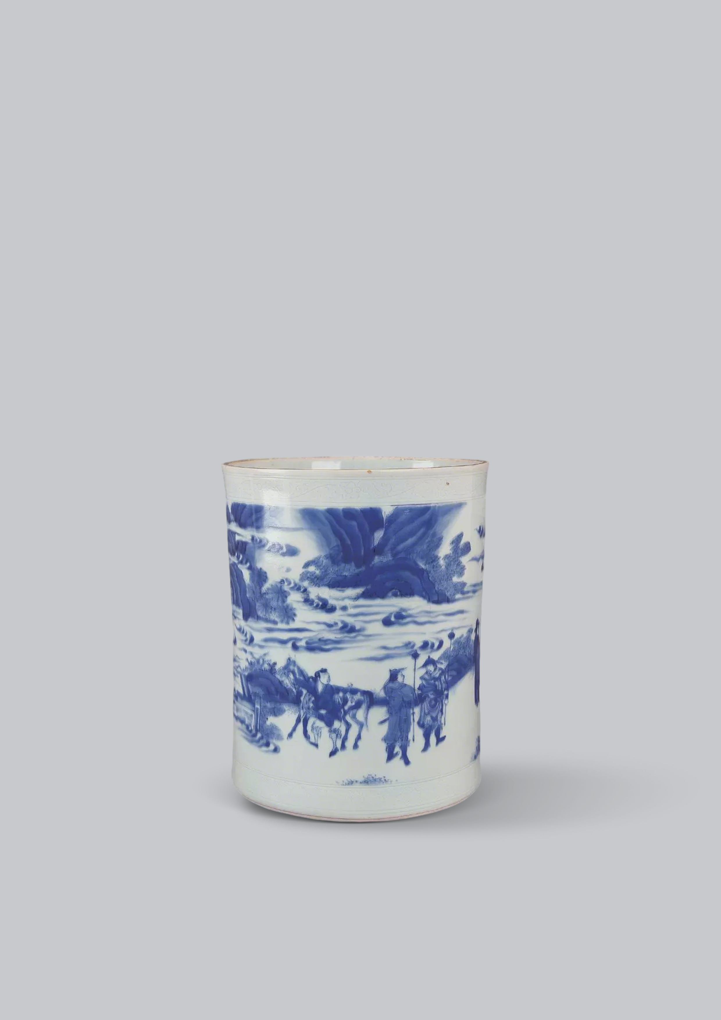 筆筒作直筒形,口沿與底足露胎並施醬釉邊,口沿下暗刻卷草紋裝飾帶,線條簡潔規整,比例勻停雅致,青花發色明快藍豔,濃淡過渡自然,通過筆觸的輕重變化營造出場景的深遠意境,體現了晚明文人畫對瓷器裝飾的深刻影響。