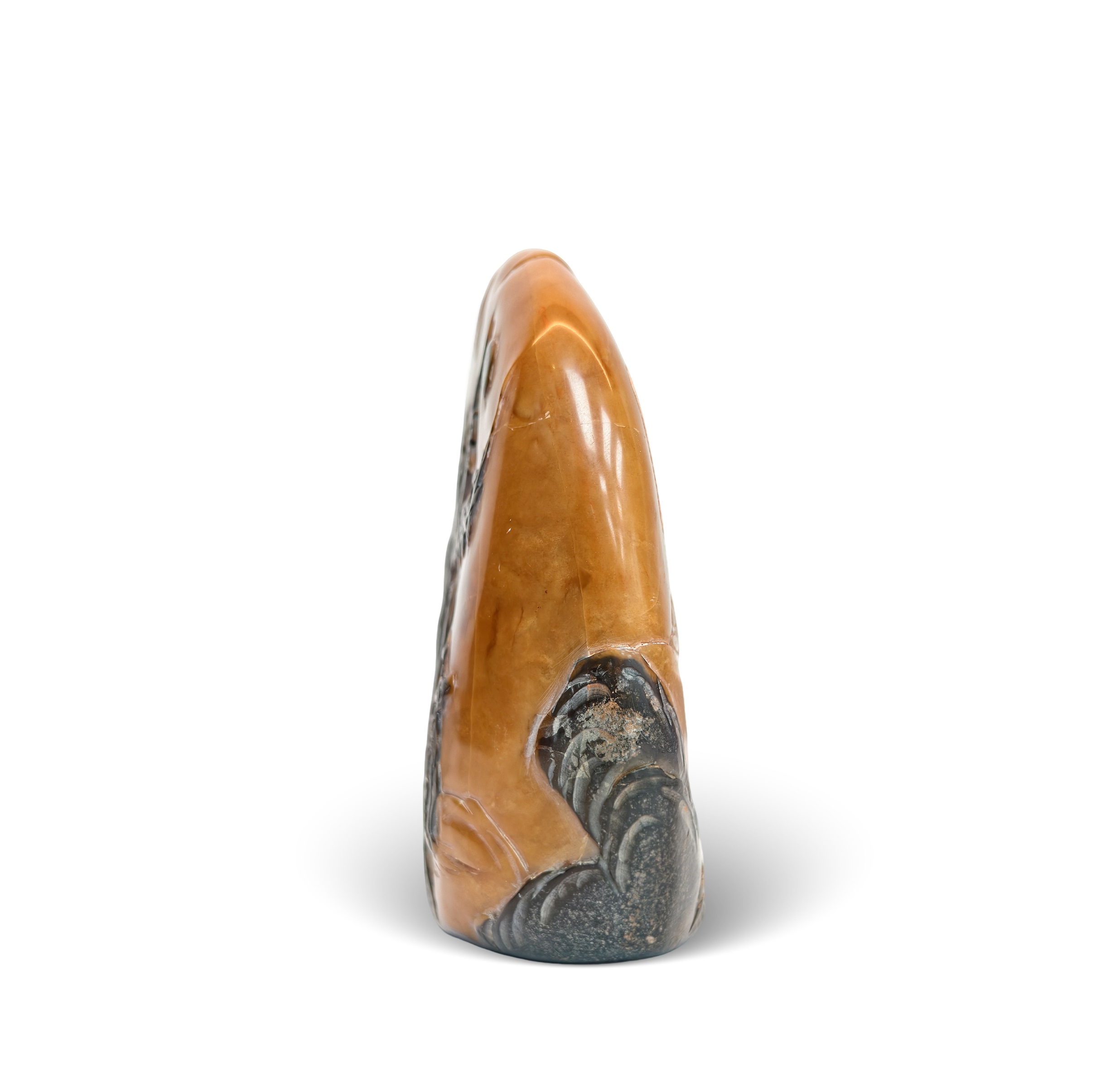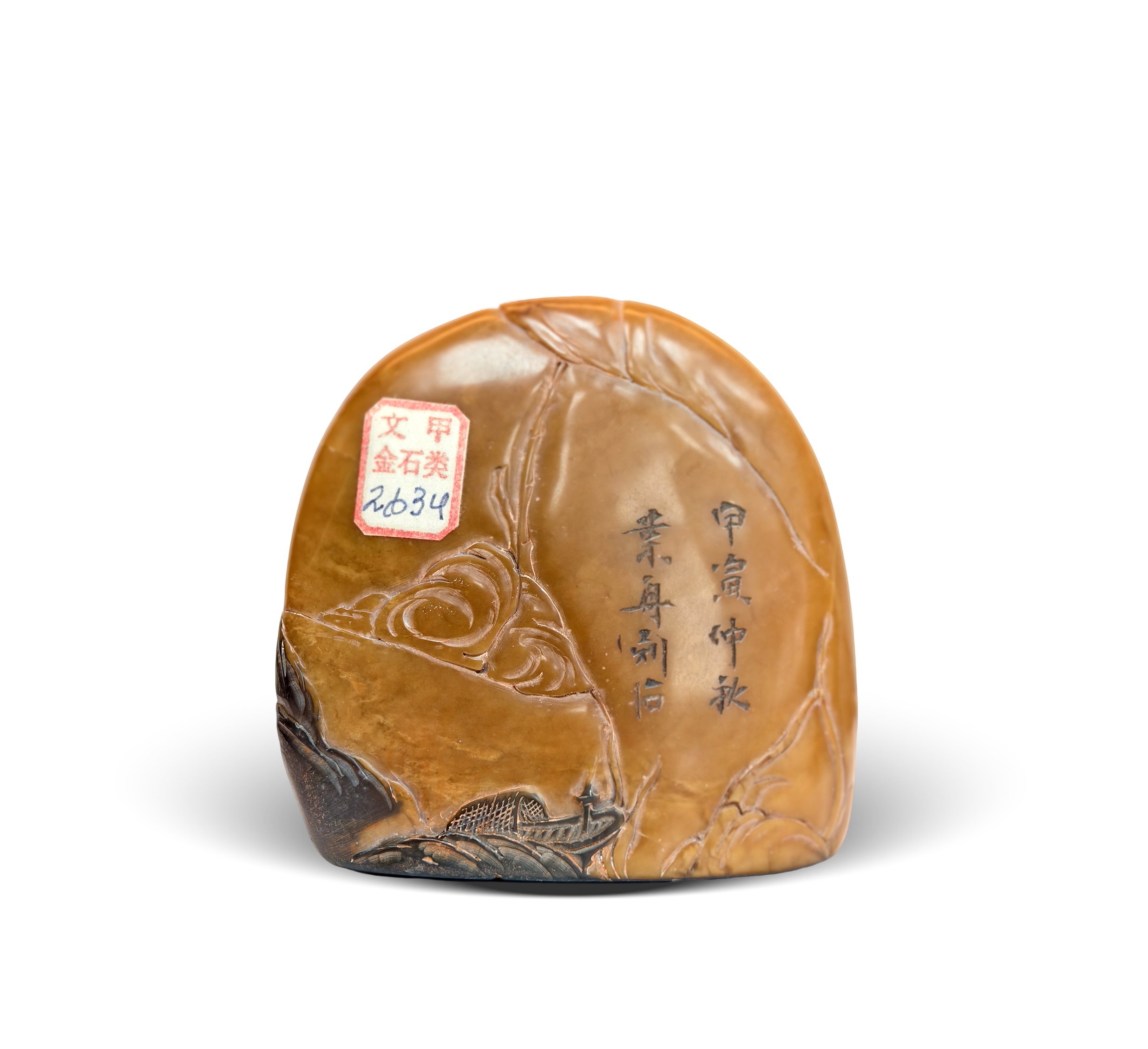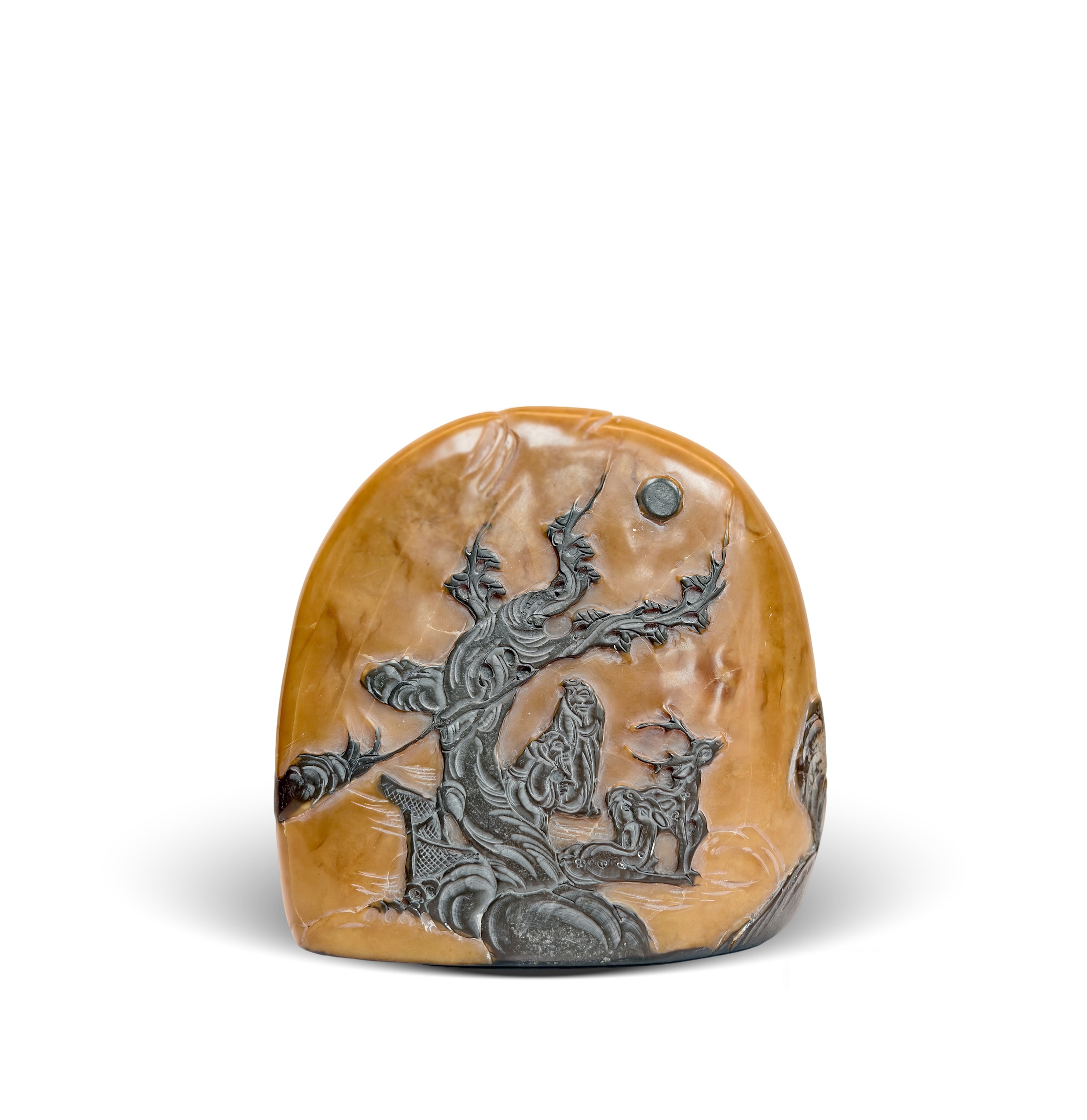 本品为乌鸦皮田黄薄意雕印章,高8.5cm,规格可观。田黄质地温润凝腻,通体覆天然乌鸦皮,黑褐相映更显古雅。以薄意雕技法精琢山水、人物、瑞兽等题材:或现老树虬枝、高士坐鹿伴月之幽,或作波云轻漾、叶舟别后之境,刀工流畅如笔,层次分明见巧思。印面篆书古朴匀整,侧款“甲寅仲秋 葉舟刻石”纪年寄情,文化意蕴深植。材质珍稀、工艺卓绝、意韵悠长,诚为薄意雕田黄章中佳制,极具高艺术与收藏价值。