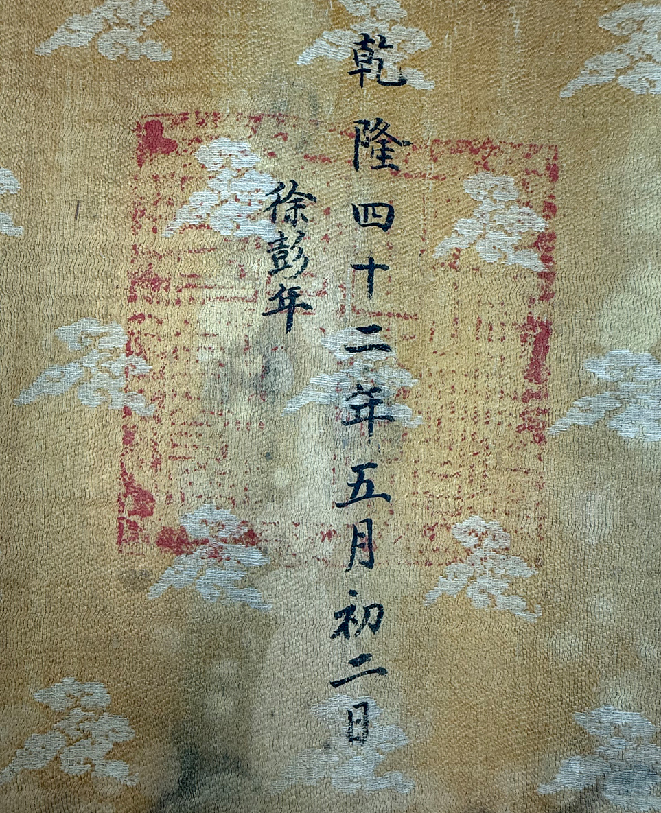 此件長卷為清代朝廷頒發之「五色誥命聖旨」,是彰顯官員功勳與表彰家世之重要典制文書。其採用上等絲絨織成,以黃、紅、白、藍、綠五色分段,分別對應天地五行與方位等級,色彩絢爛而儀制森嚴。卷中文字以滿漢合璧雙語書寫,並以金線勾勒,字跡端莊凝重,邊飾則以繁複雲龍紋與吉祥圖案織就,工藝精湛華美。其顏色配置與圖案規制嚴格遵循《大清會典》所定,是研究清代官僚品階制度、皇家禮儀及江南織造技術的珍貴實物。此聖旨不僅承載著清廷的政治威儀與榮典文化,其本身亦是清代絲織藝術與制度美學高度結合的典範之作,具有極高的歷史文獻與藝術工藝價值。
