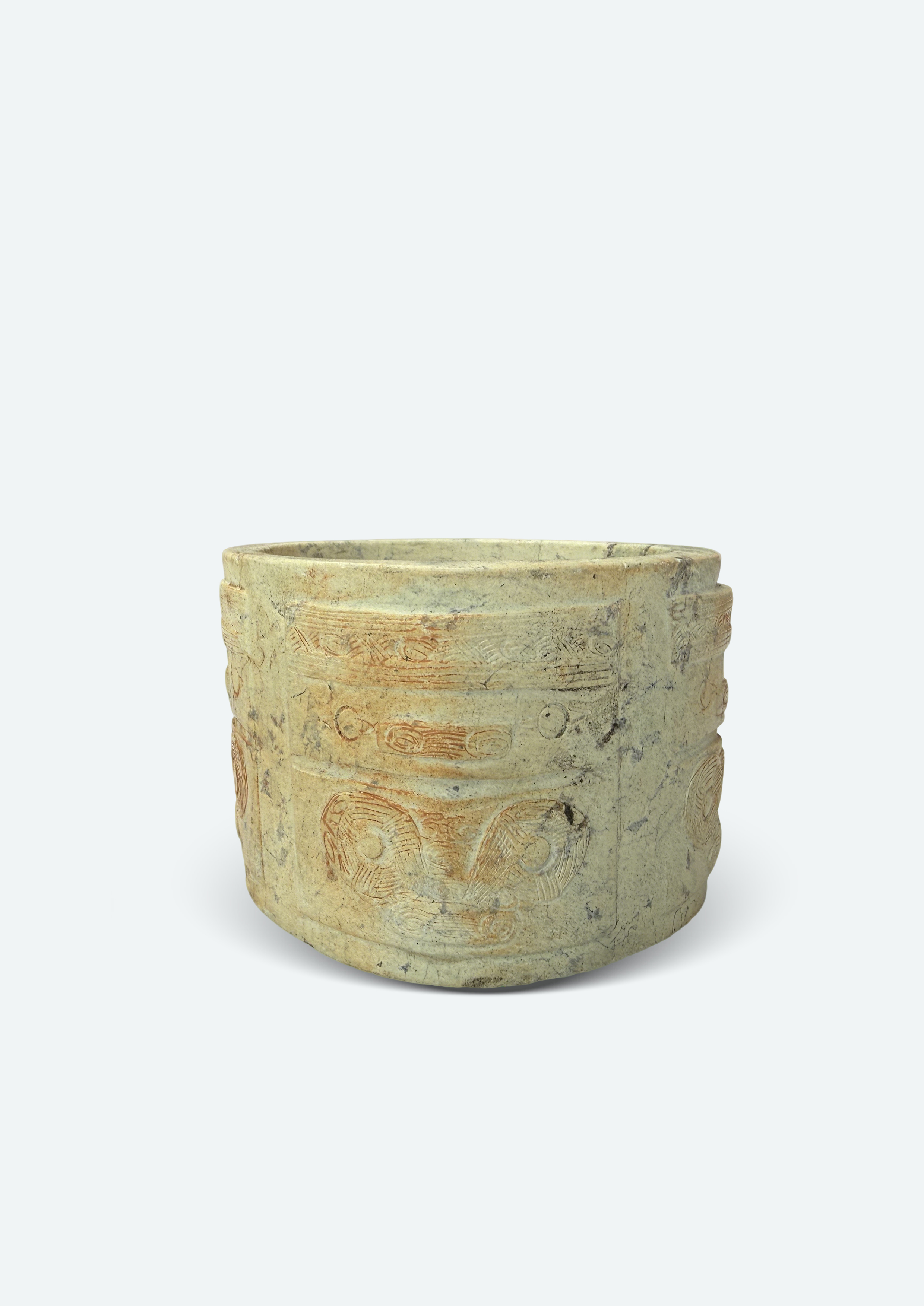 此件玉琮為良渚文化(約公元前3300—前2300年)典型玉器,屬新石器時代長江下游太湖流域文明的標誌性器物。器形為外方內圓的方柱體,中空貫通,體現良渚人「天圓地方」的宇宙觀。玉質呈青灰色,帶有自然沁色與歲月包漿,質地溫潤堅硬,符合良渚玉器選料精良、雕琢考究的特點。器身以減地淺浮雕工藝雕刻神人獸面紋(良渚「神徽」):上部為神人形象,頭戴羽冠,雙目圓凸,鼻樑隆起,下部連接獸面,雙目突出,鼻寬齒齊,紋飾線條簡練而神韻威嚴,是良渚先民宗教信仰與權力象徵的核心圖像。神人獸面紋重複出現於琮體節面,布局對稱,工藝精湛,展現良渚玉器「層層刻畫、神祕莊嚴」的藝術風格。