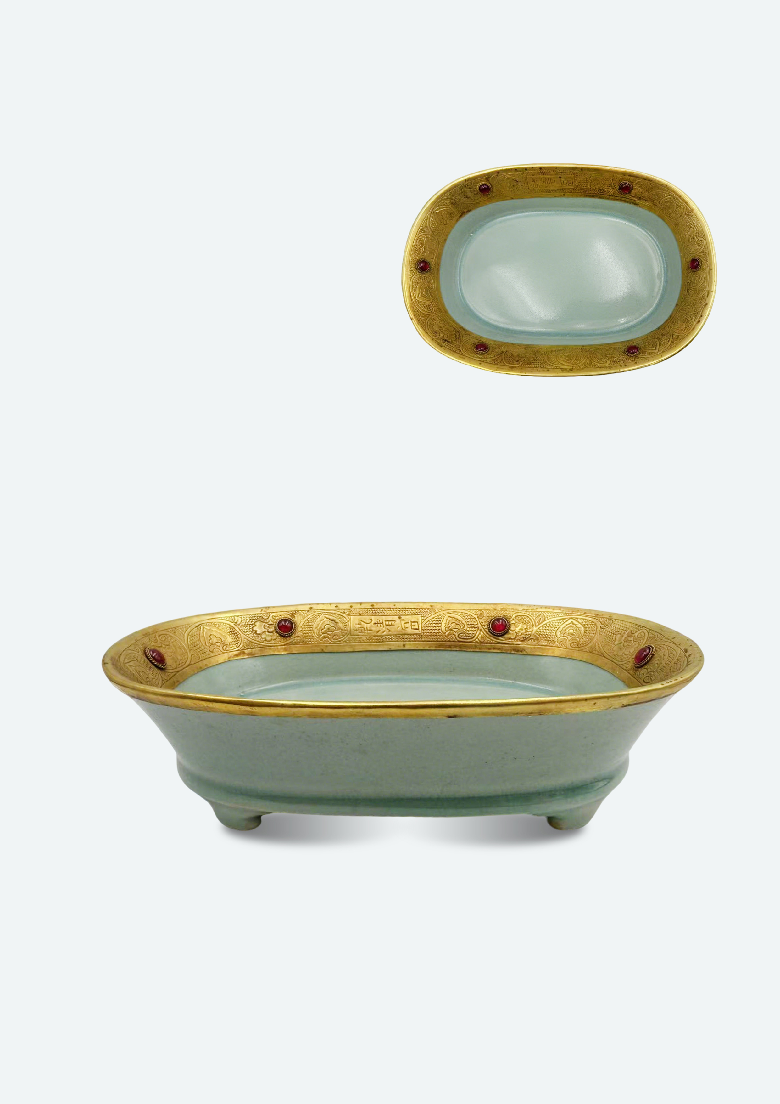 此水仙盆為宋代汝窑宮廷用器的典範,器形呈橢圓形,淺腹、圈足,內底素淨,外壁施天青釉,釉色勻淨瑩潤,開片含蓄自然。 盤沿以鎏金工藝裝潢纏枝花卉紋,間嵌紅寶石(或仿寶石),金碧璀璨與天青素雅形成鮮明對比,既顯皇家奢華氣象,又不失文人士大夫的清雅格調。 此類鑲金嵌寶的汝窑器物,多為宮廷賞玩、祭祀陳設或文房清供之用,結合汝窑釉色與金屬、寶石工藝,展現了宋代“以玉載禮、以金彰貴”的審美融合,是宋代工藝跨界創新的珍貴遺存,對研究宋代宮廷生活、器物裝潢工藝及汝窑使用場景具有重要價值。