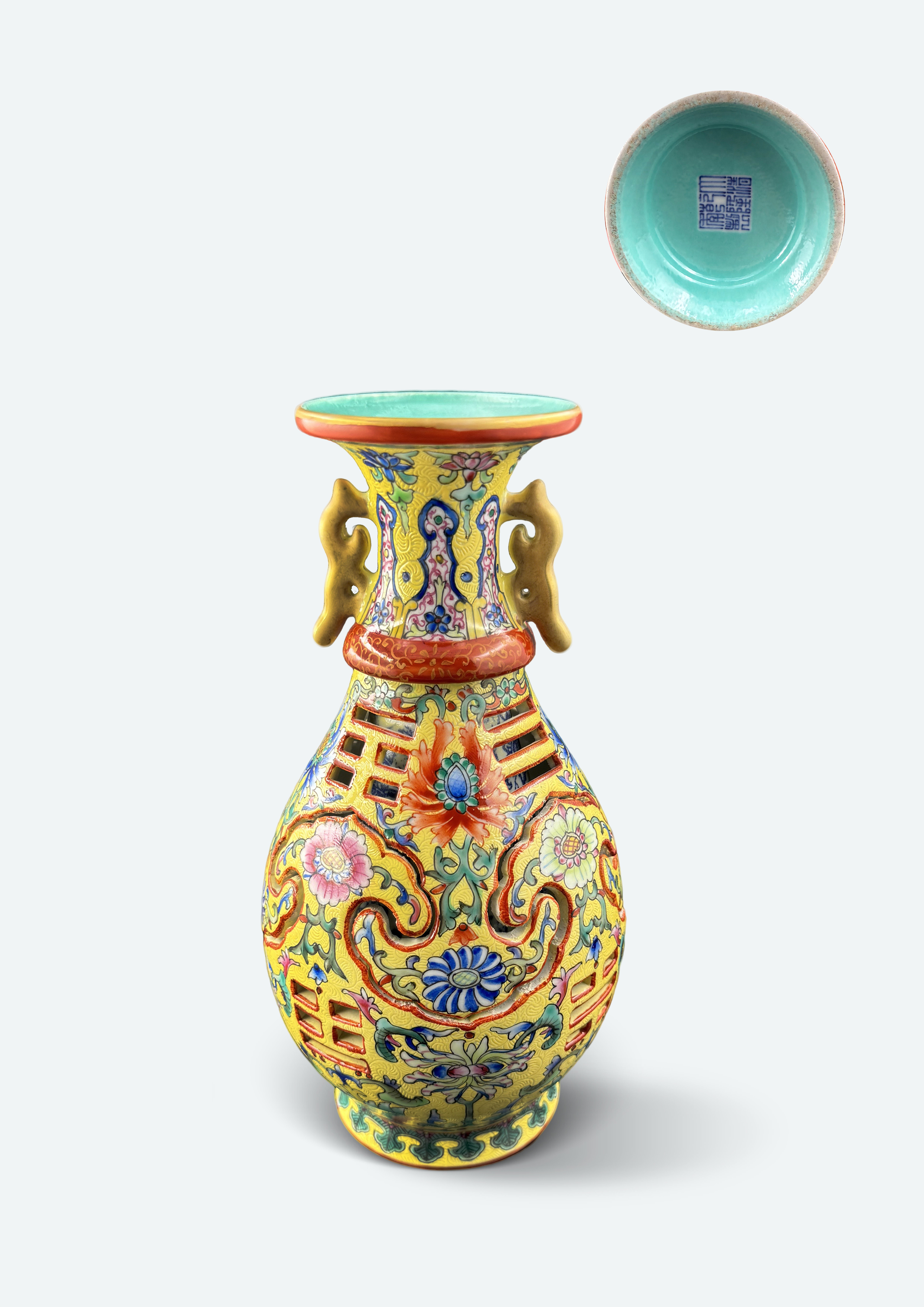 藏 品:清乾隆 黃地軋道珐琅彩鏤空交泰轉心瓶