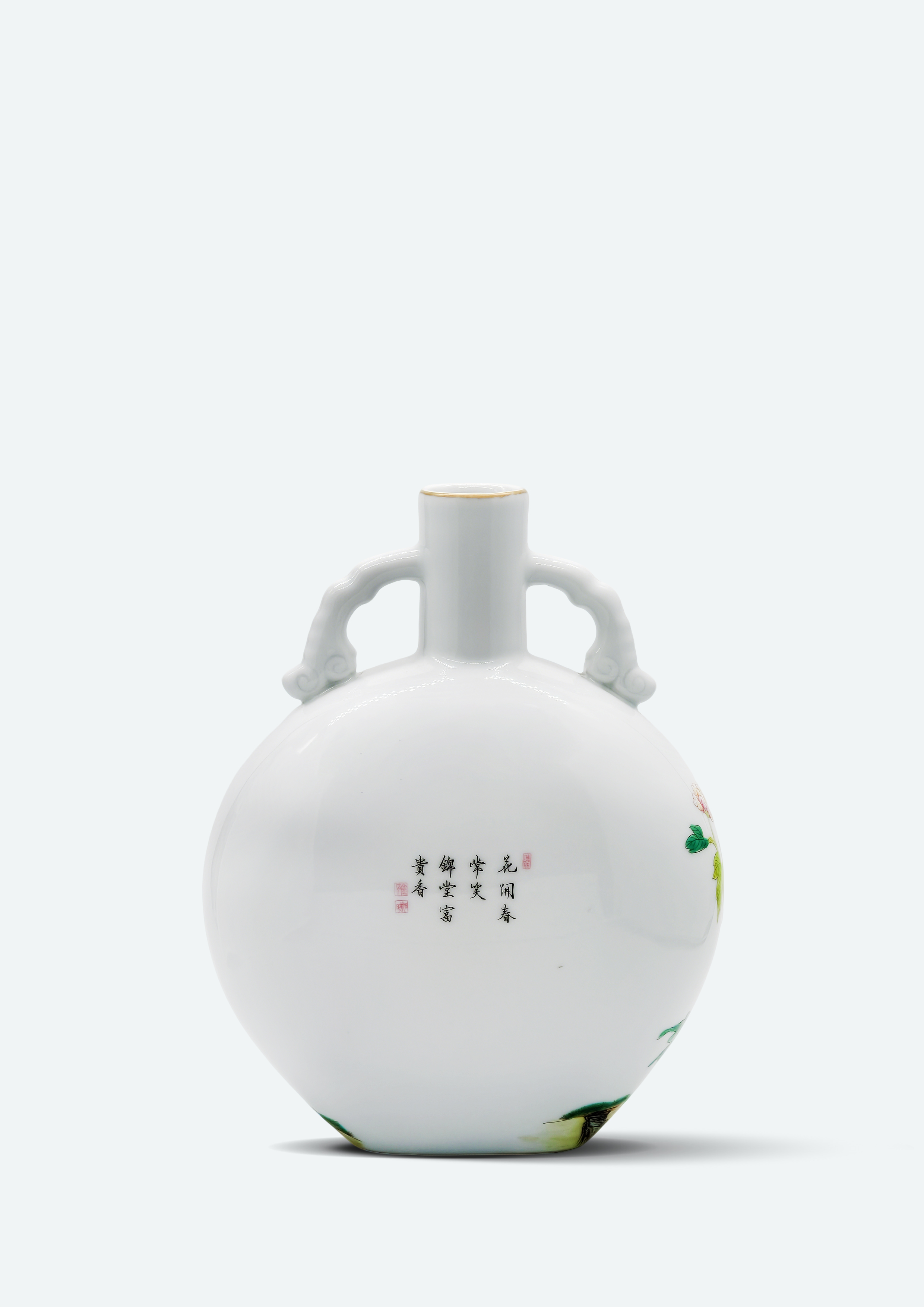 瓶身形制經典,取宋元扁壺遺韻,直口細頸,扁圓腹如皓月半抱,頸肩飾如意形雙耳,線條流暢婉轉,對稱之中見雅致,暗合 “天圓地方” 的東方哲思,盡顯雍正禦瓷 “秀雅規整” 的審美特質。