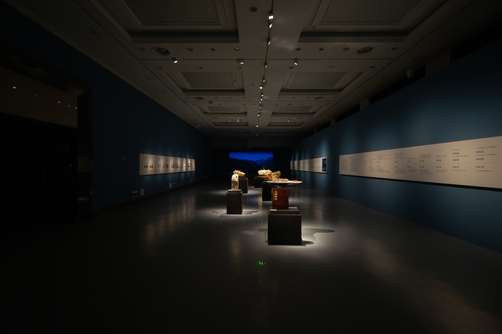 展览还展出了青田石雕工艺所用的工具及青田县石雕厂的发展大事记。斑驳的工具与诉说着岁月的文字像一条流淌的河,环绕着五件最具分量的献礼作品,宏大又悠扬。
