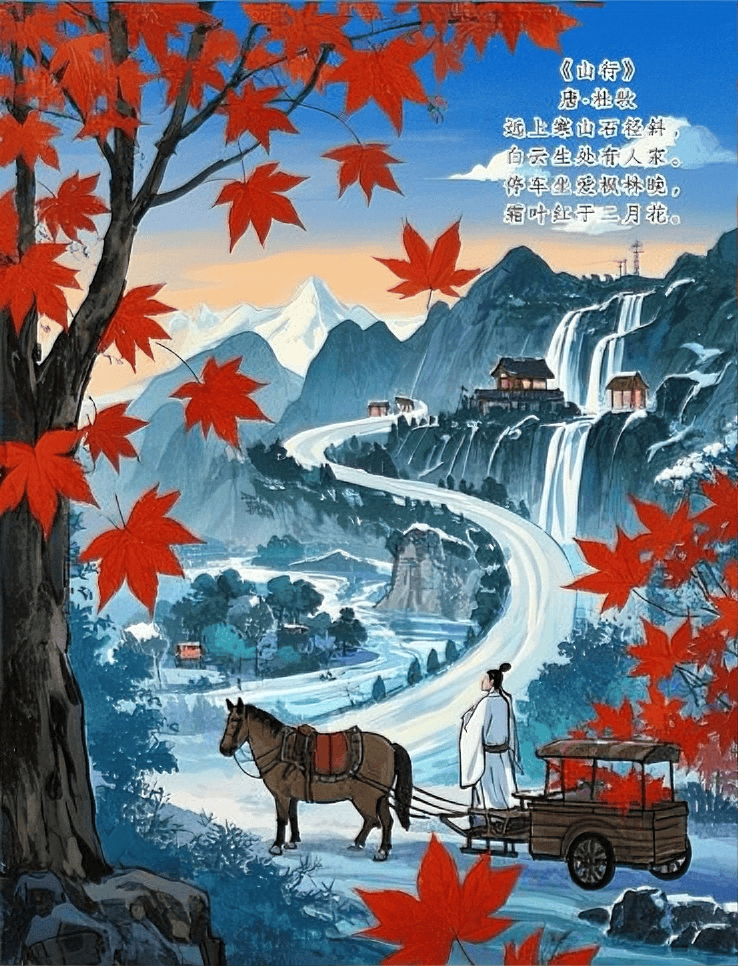 上半部,一幀泛黃的扇形箋紙靜臥其上,唐代詩人杜牧那首家喻戶曉的《山行》以灑脫飄逸的行書揮就,“遠上寒山石徑斜,白雲生處有人家。停車坐愛楓林晚,霜葉紅於二月花”的詩意躍然紙上。朱紅印章一點,既是歸屬的標記,亦如楓林間的一抹亮色,為墨韻平添華彩。