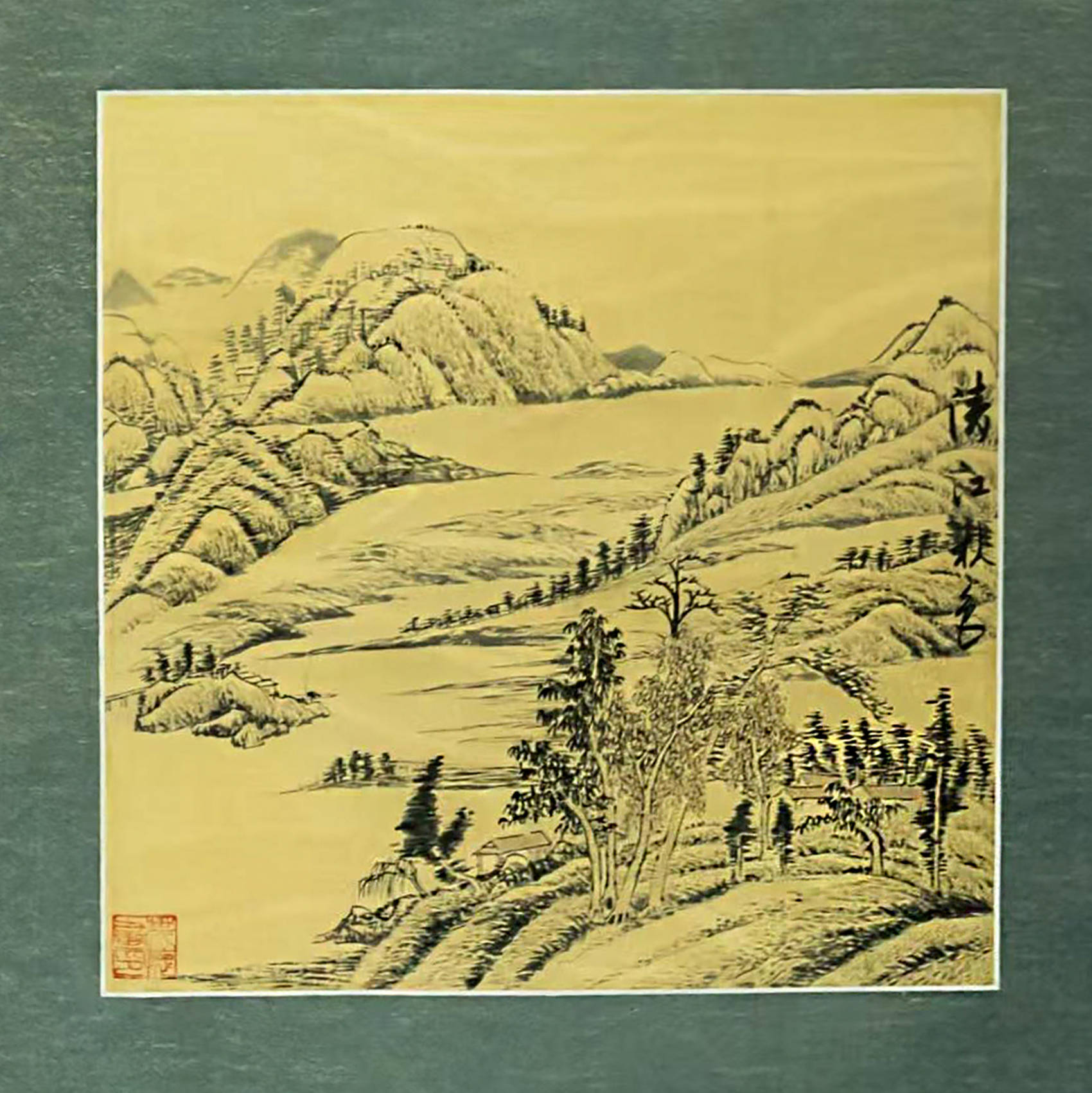 詩為畫魂,畫為詩境。扇面之下,一幅意境悠遠的淺黃底色山水畫徐徐展開。畫中筆觸細膩,連綿山巒若隱若現於雲氣之間,一泓清水蜿蜒流淌,樹木屋舍錯落有致,一條小徑引人遐思,仿佛正是詩中那條“石徑”,通往白雲生處的寧靜人家。畫面右下角同樣鈐有紅印,與詩篇印章遙相呼應,完成了藝術形式與精神內涵的完整閉環。這不僅是杜牧詩中秋山明淨畫卷的視覺呈現,更深蘊著古代文人“不下堂筵,坐窮泉壑”的寄情山水之思。