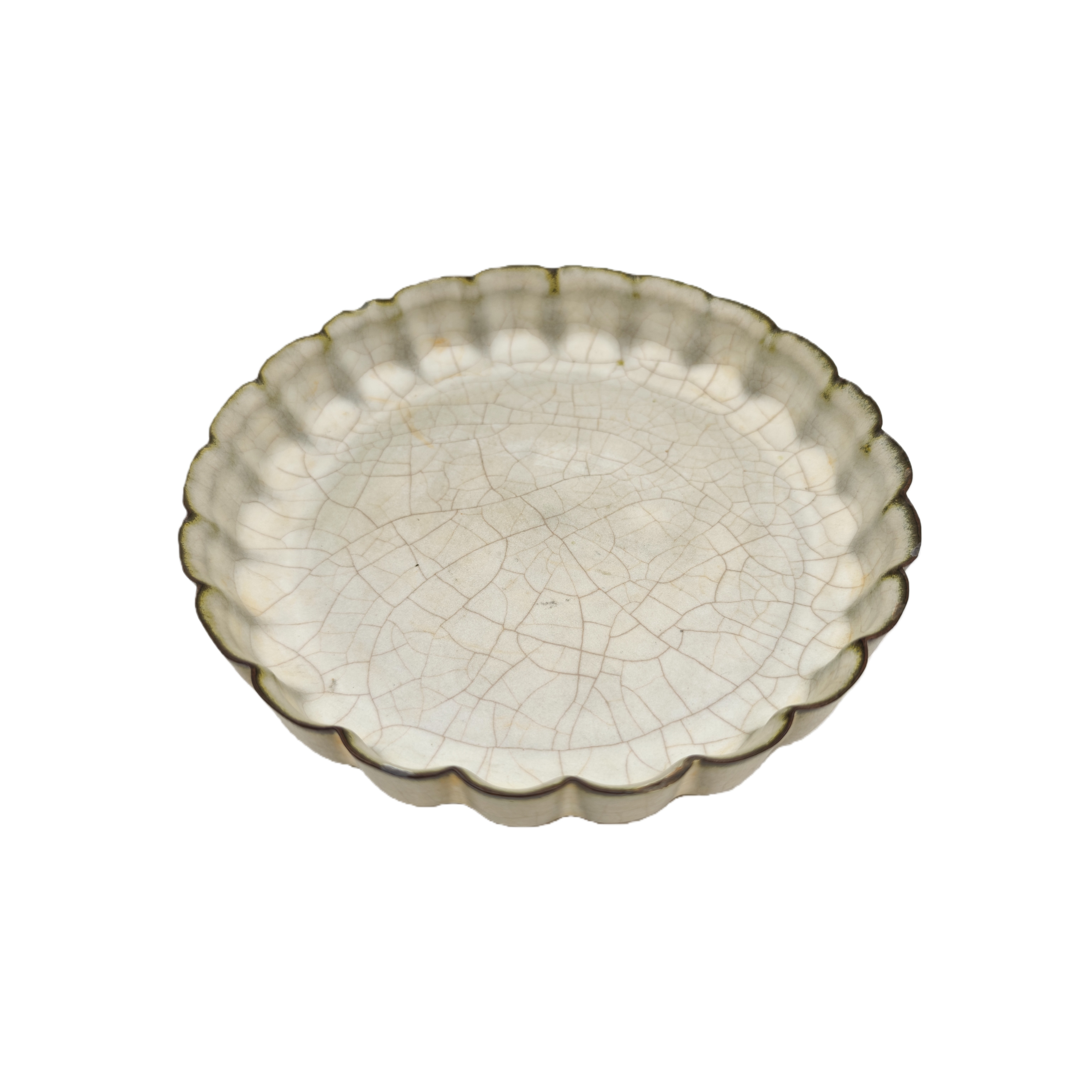 本品盘身菊瓣形,浅腹,圈足。釉面犹如酥油般光泽,色调丰富多彩,釉面有网状开片,或重叠犹如冰裂纹成细密小开片。釉内含有气泡,如珠隐现,线条流畅,既为柔美,通体伴随有开片,釉面大小纹片相间,错落有致。铁线清晰自然,施釉丰腴匀净,釉色莹润自然,平整光亮。自烧制以来,因流传稀少格调高雅造型庄重、古朴典雅。釉色淡雅自然,线条纤细含蓄,色泽柔和,清丽潇洒而不失挺秀,于静谧中散发出不饰粉黛、洗去铅华之自然之美。追求轻松灵动的美感,周身纹片致密,静穆古雅。深者呈紫褐色,浅者则为金黄色,大小纹片相间,深浅两色交织,遂成典雅美观的金丝铁线。整器端庄秀美,以器型和釉色取胜,富有韵律感,丽质怡人,变化无穷,整体古朴之既。官窑瓷多有纹片,有大小开片,亦称“文武片”。纹片有疏有密,有深有浅,以冰裂纹等大纹层为主,所谓“冰裂纹”者,如同冰糖、云母一般,层层而下,多角形的开片,显白色的纹路,由于机会不多,较为特殊。釉面出现的纹片原是一种缺陷,它由于制作过程中工艺处理不当,胎釉膨胀系数相差过大,使釉面发生裂纹,但我们的祖先巧妙地利用这种缺陷美,作为装饰瓷釉的特殊手段,使这种釉面纹路通过工艺的调整,控制裂纹的大小和疏密,形成纹片碎路,纵横交错,既不规则又在规则之中,从而达到所谓“金丝铁线”的艺术效果。