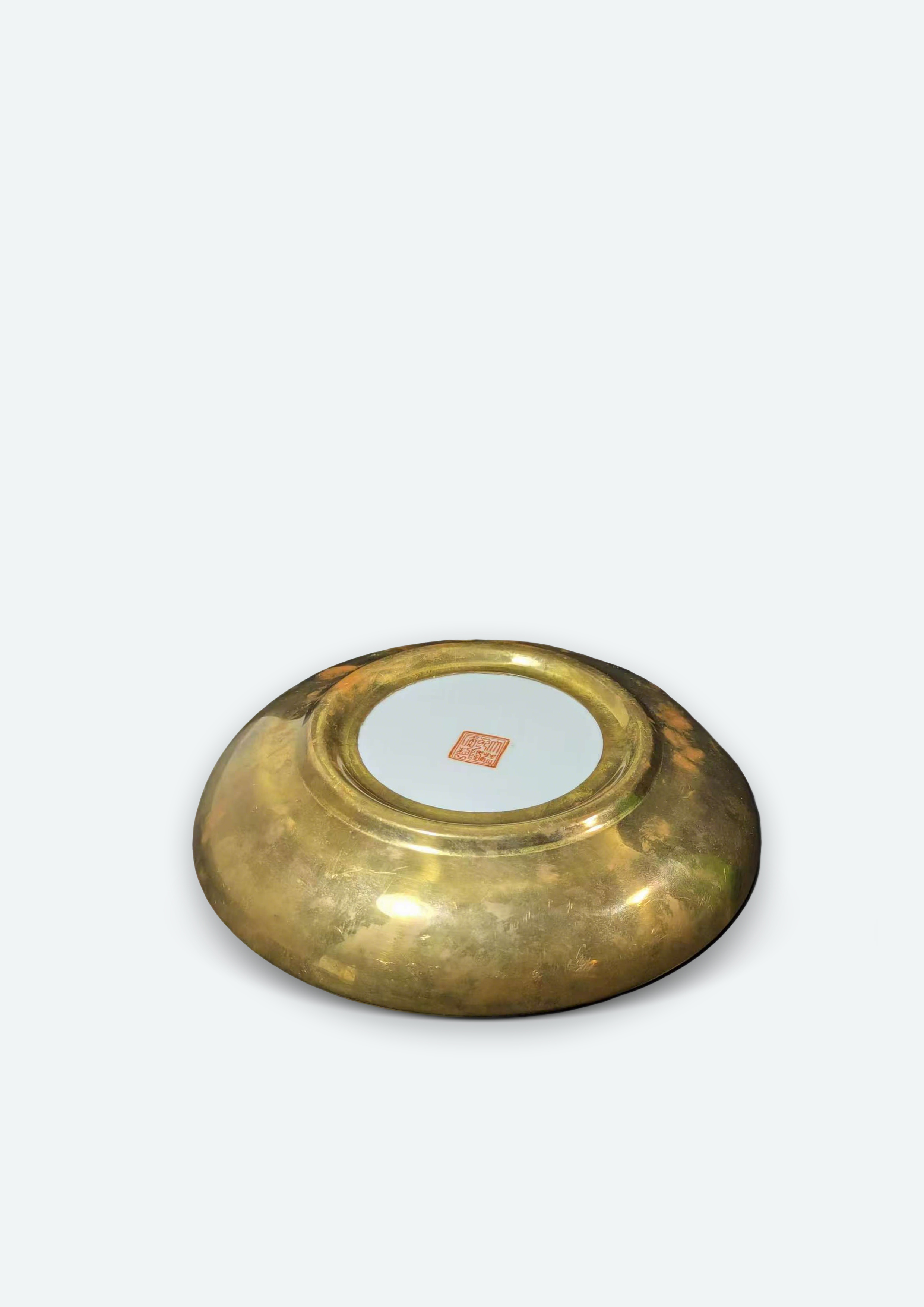 盤沿與外壁通體包金,金彩璀璨華貴,工藝繁複考究,為皇家御瓷級別的裝飾規制。