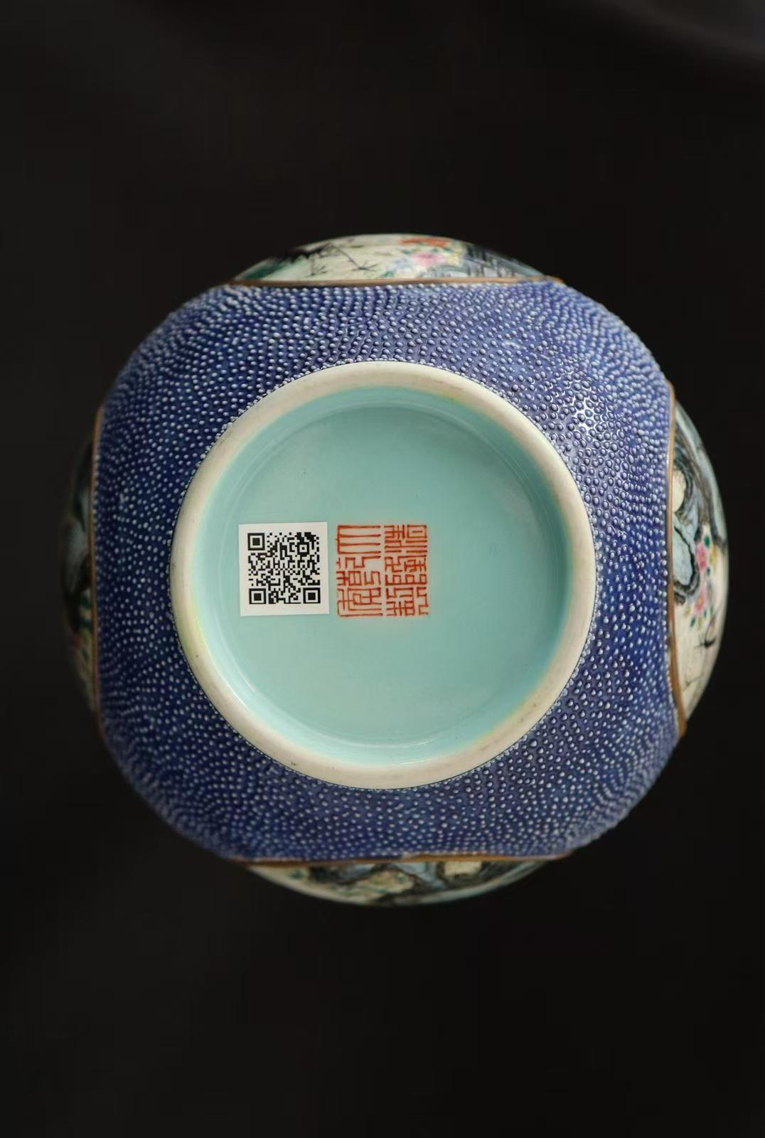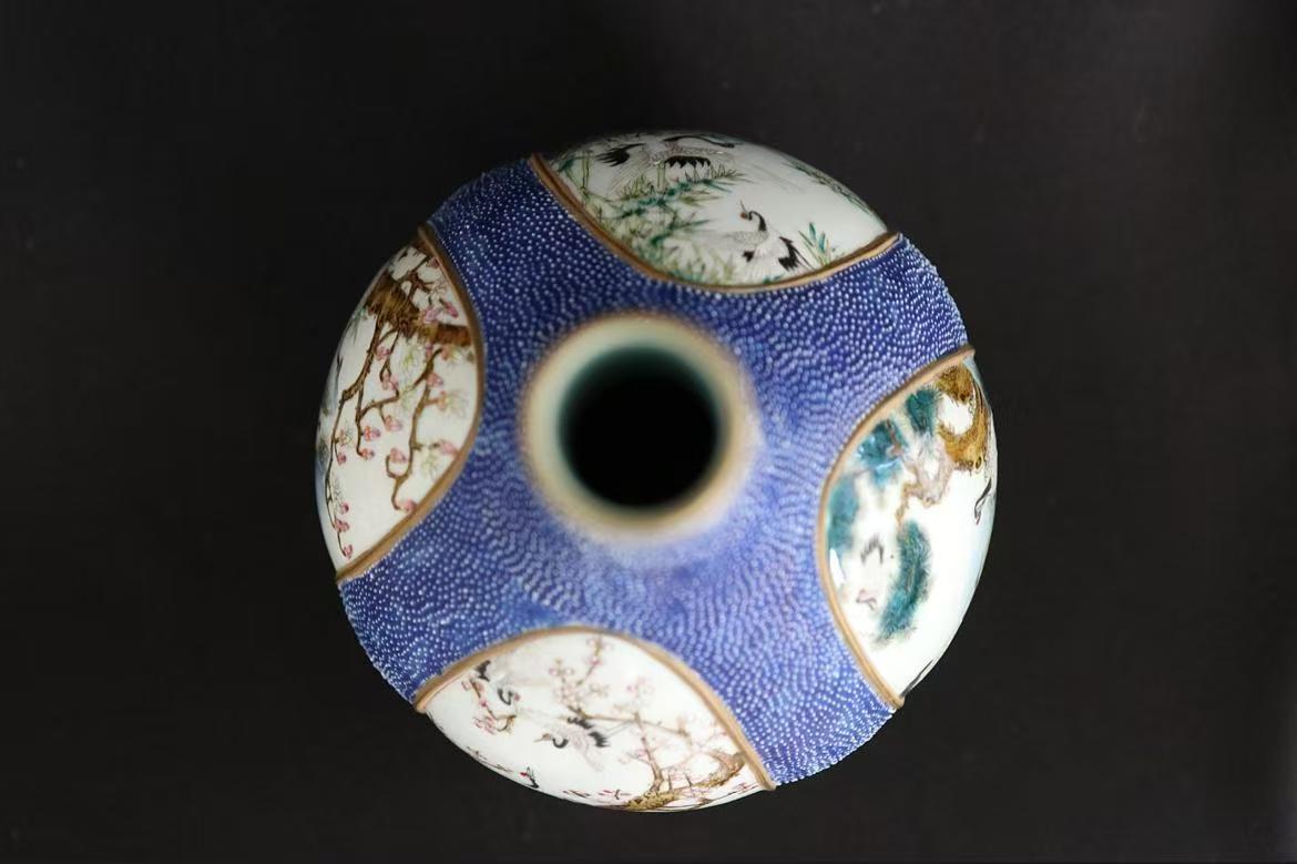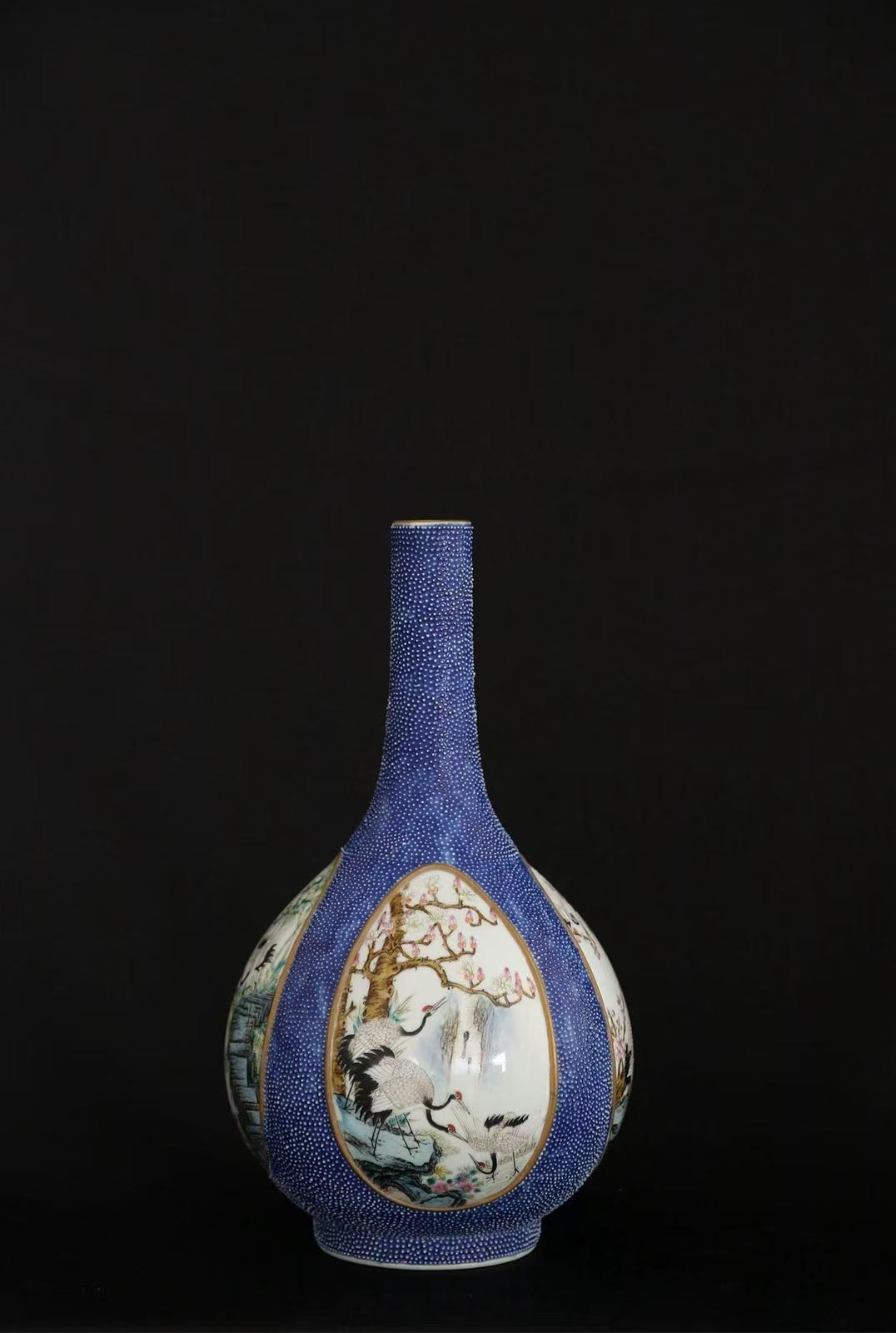 此器為清乾隆時期景德鎮御窯廠燒造的宮廷御用瓷,瓶身採用經典「膽瓶」造型——脩長頸如懸膽,鼓腹飽滿圓潤,線條從頸至腹過渡流暢自然,瓶身基調為藍釉珍珠地,瓶身開光內以琺瑯彩繪「仙鶴花卉圖」,琺瑯彩作為宮廷獨享的高端裝飾技法,工藝複雜度極高,紋飾態勢靈動寫實。其題材、工藝與風格,既是乾隆朝「盛世尚奢」審美取向的縮影(追求材質珍稀、工藝繁複、寓意吉祥),也見證了清代宮廷藝術「集天下能工巧匠,匯中西文化精華」的恢弘氣象。
