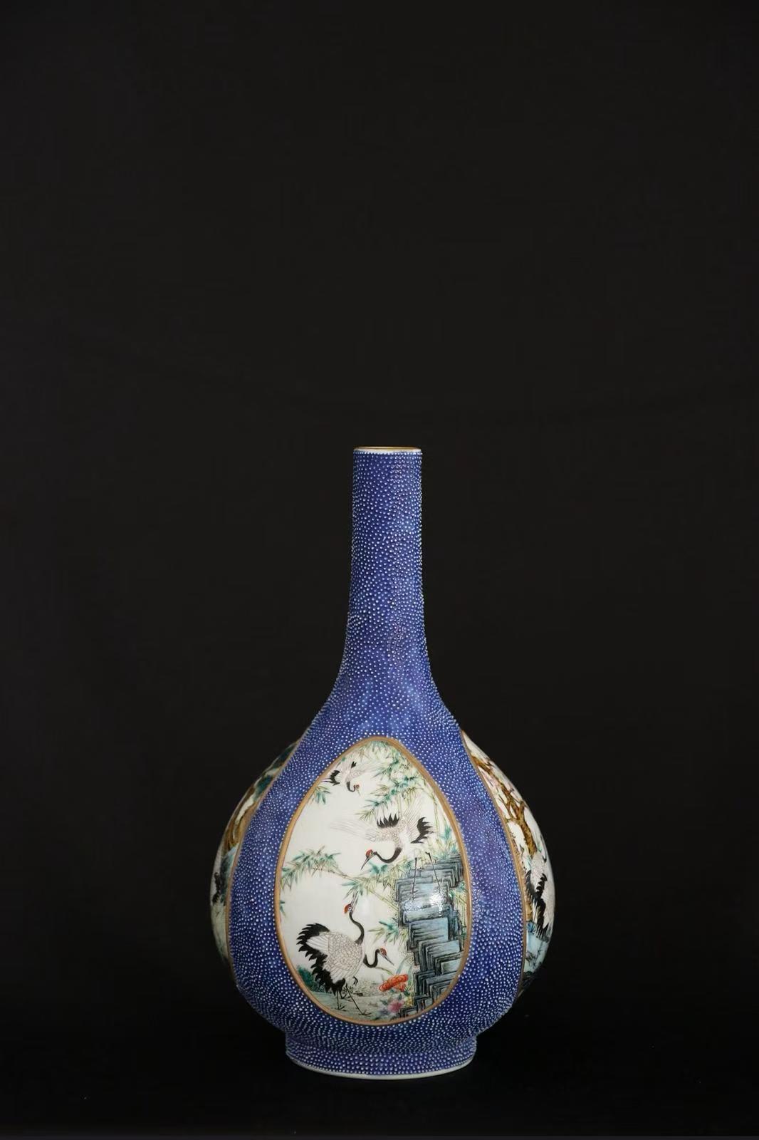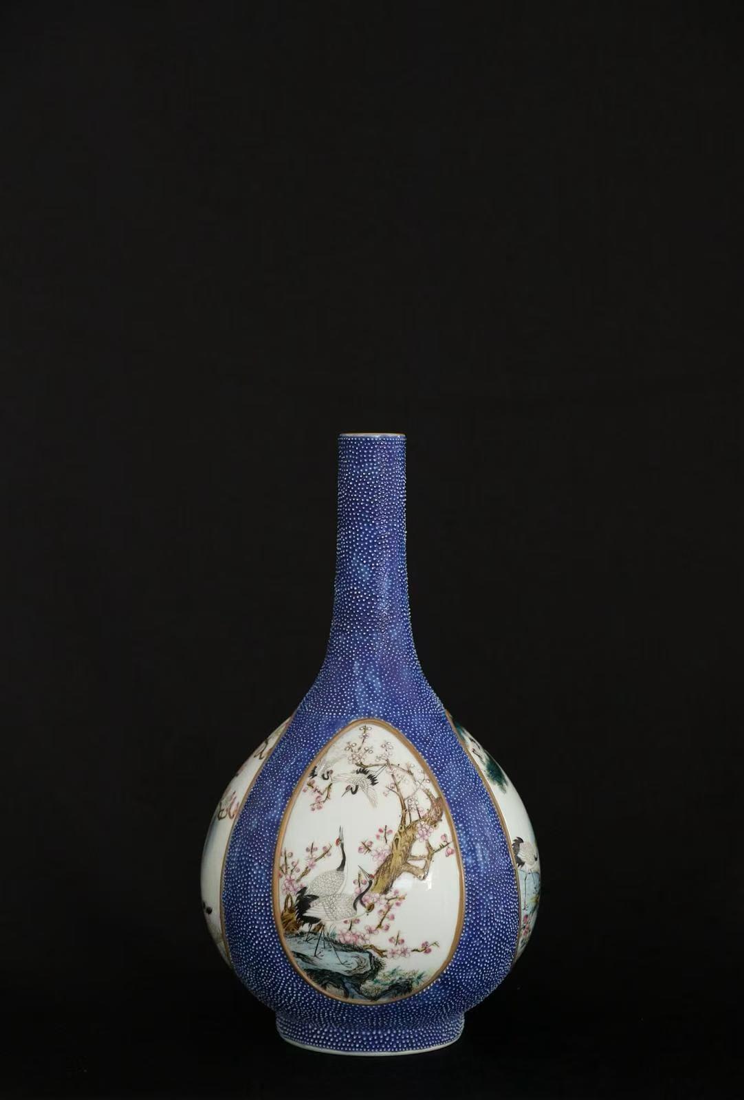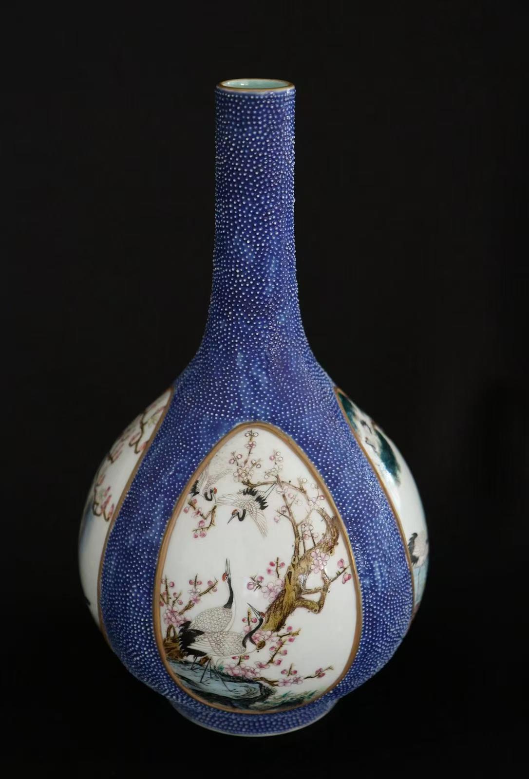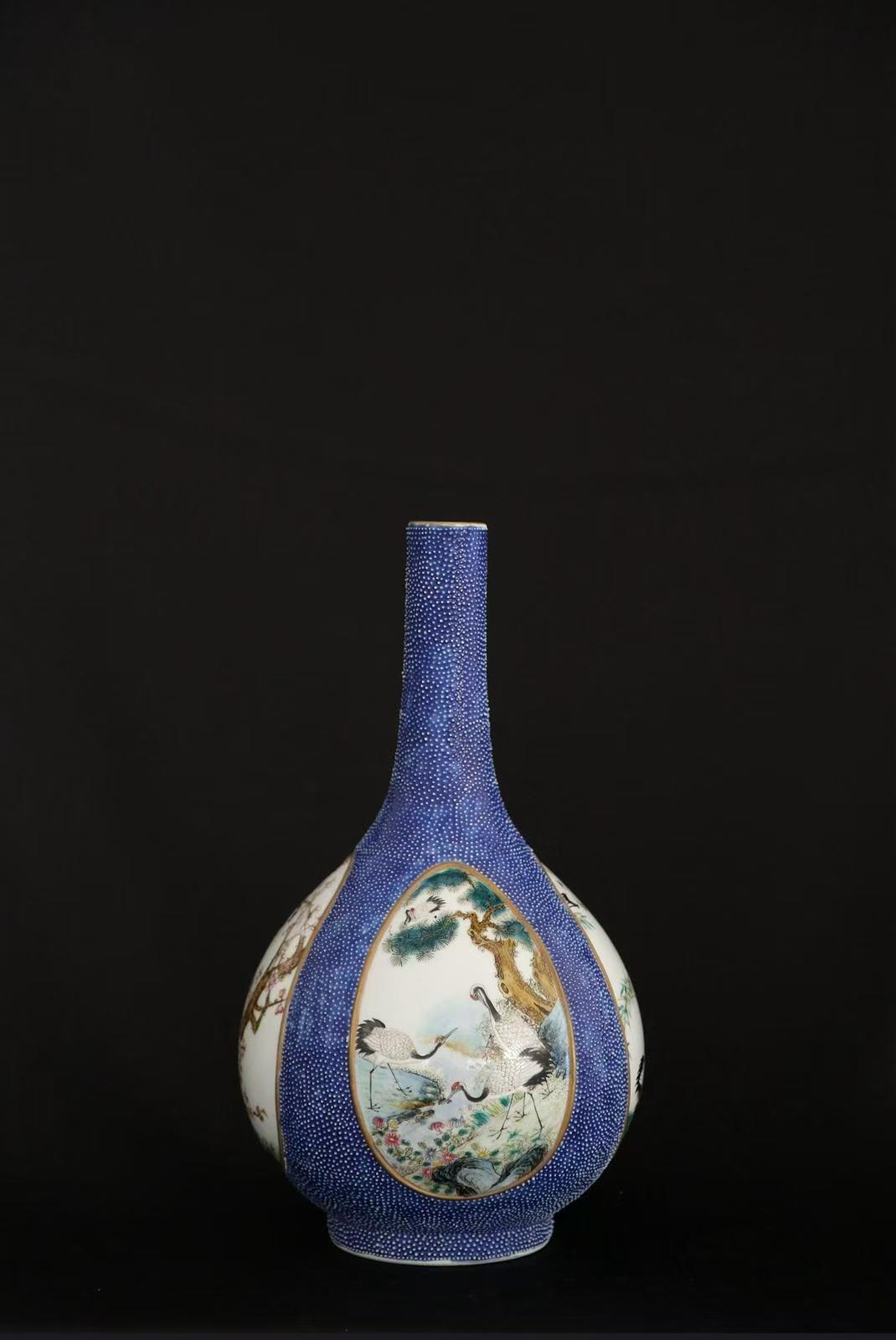 藏 品:清乾隆 藍釉珍珠地珐瑯彩仙鶴花卉紋膽瓶