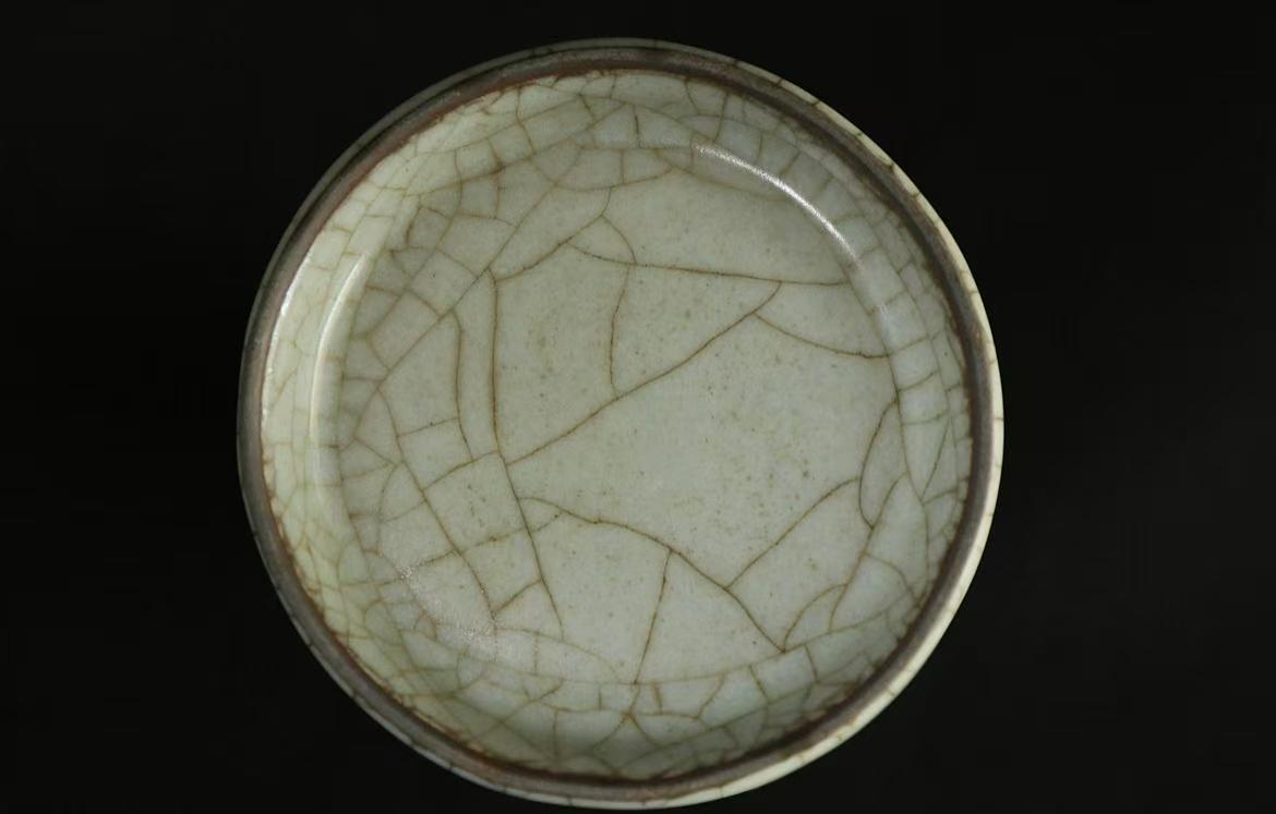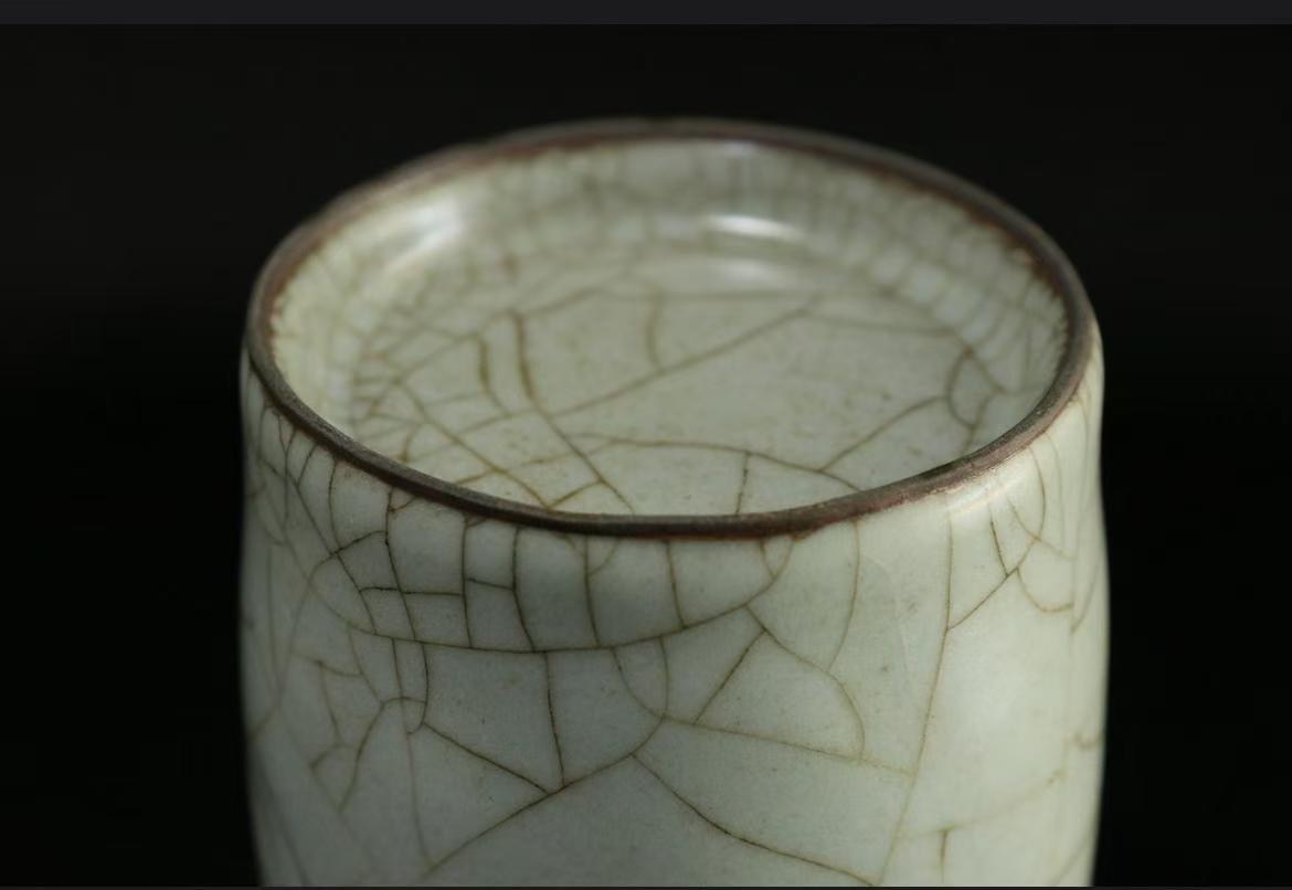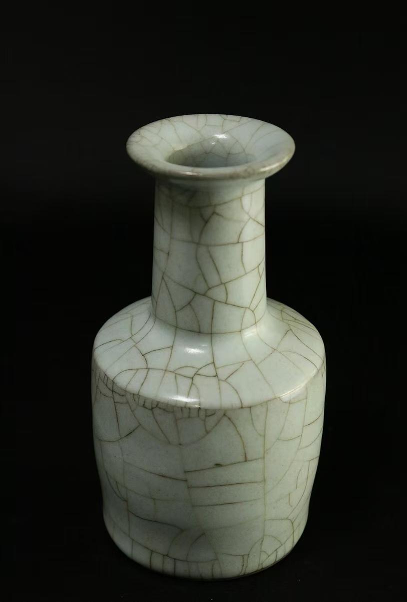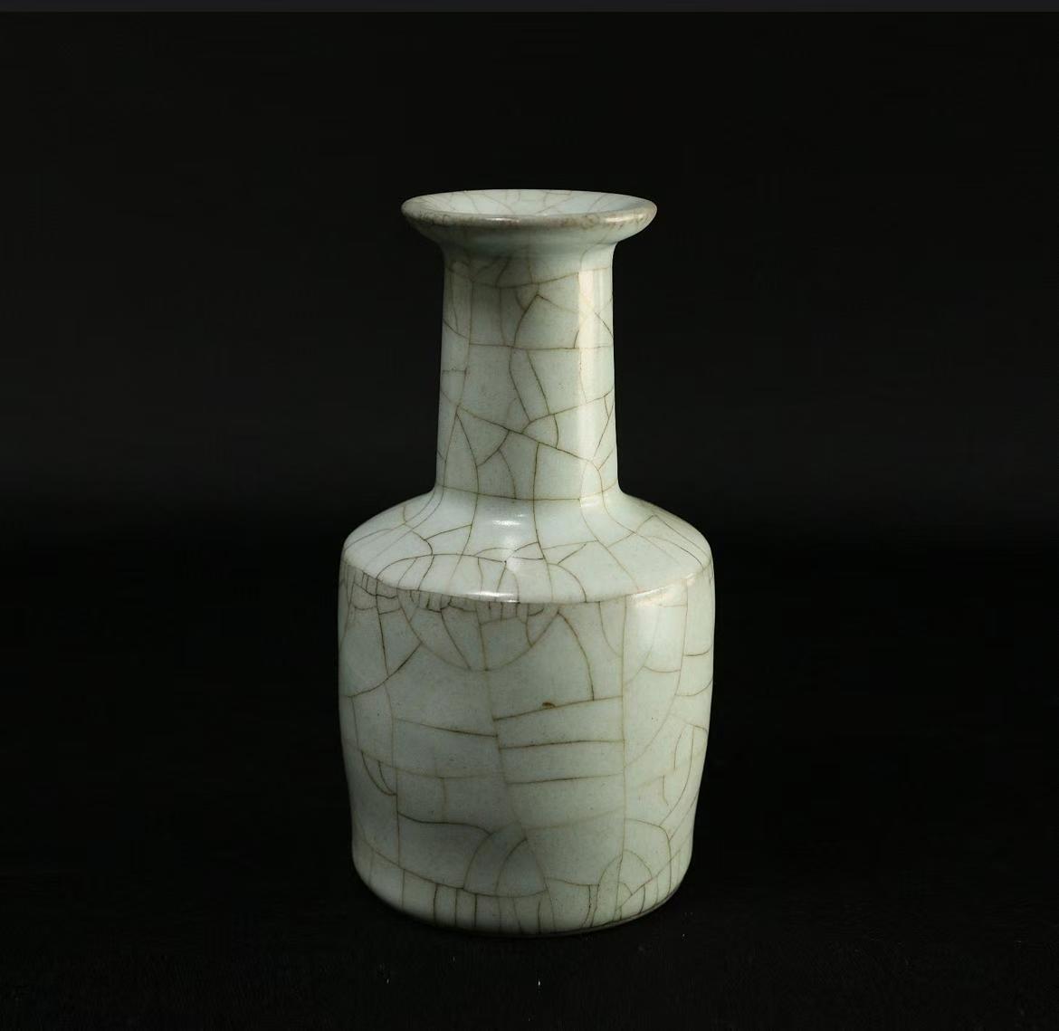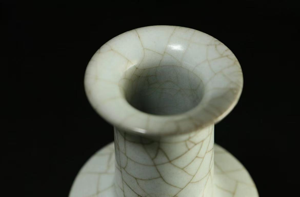 此器為宋代官窯所制的紙槌瓶,是宋代官窯體系(分北宋汴京官窯、南宋修內司/郊壇下官窯)中極具代表性的陳設器,紙槌瓶因形似“槌搗紙帛之器”得名,口沿微敞外撇,弧度自然流暢,頸部,細長挺秀,過渡舒緩,腹部飽滿圓鼓卻不臃腫,比例勻稱,底足內斂收束,與修長瓶身形成“上舒下穩”的視覺平衡。整體線條婉轉克制,無冗餘裝飾,釉色呈天青色,釉層豐腴瑩潤如凝脂,胎質緻密細膩,施釉時“釉裹胎”,足底露胎與釉色形成“紫口鐵足”的經典對比,古樸厚重中見皇家氣度。宋代官窯為皇家禦窯,製作不計工本,以“極致工藝”服務皇權審美;而紙槌瓶的流行,既因宋代文人“插花、賞瓶、靜思”的生活雅趣,也映射出整個時代對“簡約素淨、意境悠遠”美學的集體推崇。