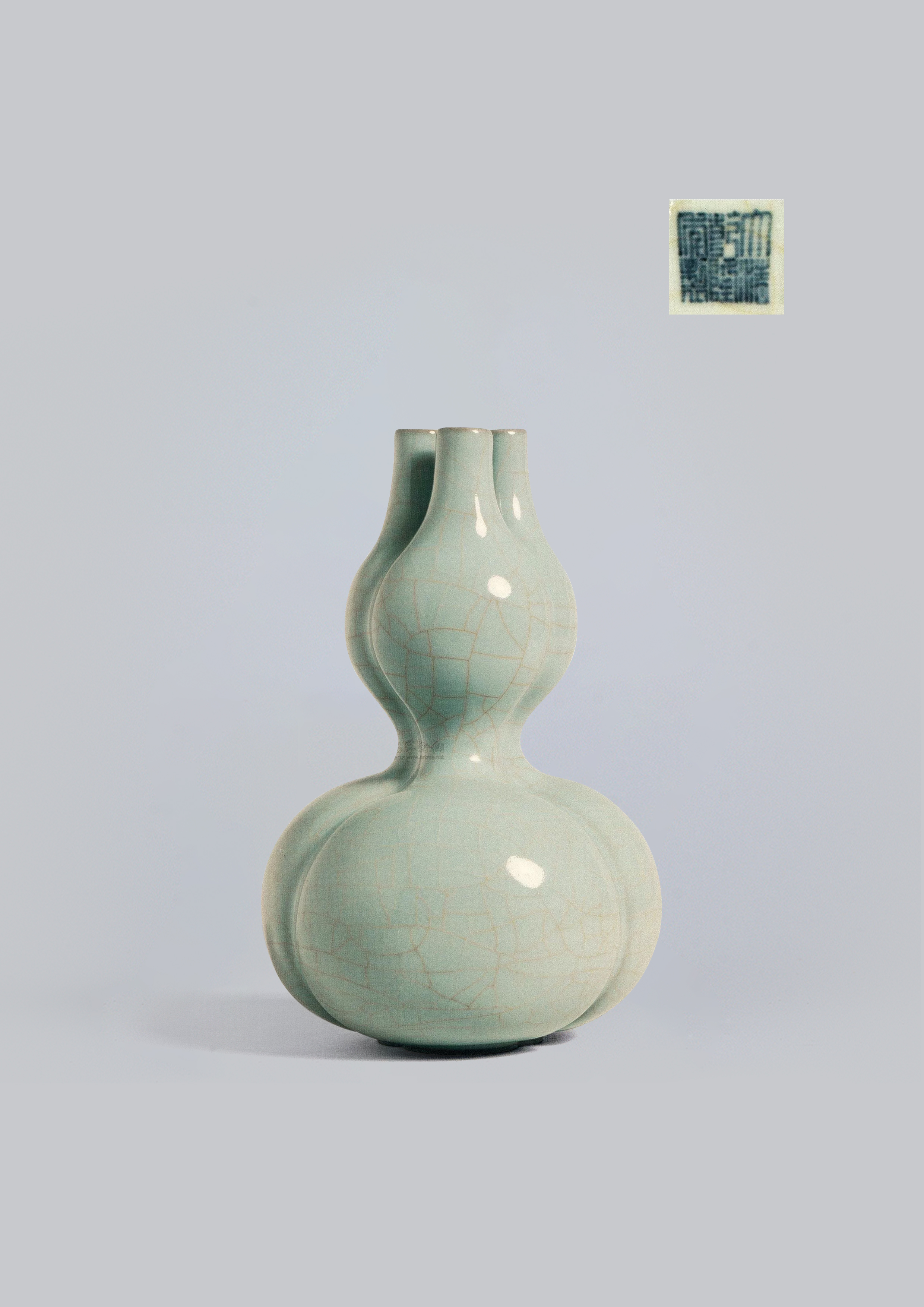 此器清乾隆官窯 “仿古融新” 的經典器作,以宋官窯韻致為骨、本朝精工為魂,詮釋宮廷瓷的雅巧質感。三連葫蘆為仿生組合式造型,上下葫蘆體、三開口均單獨制坯後,經手工精准對齊粘接,再通體修胎打磨,確保每處弧面、開口的對稱度與流暢度,盡顯乾隆官窯 “形制巧致、規整極致” 的工藝追求。