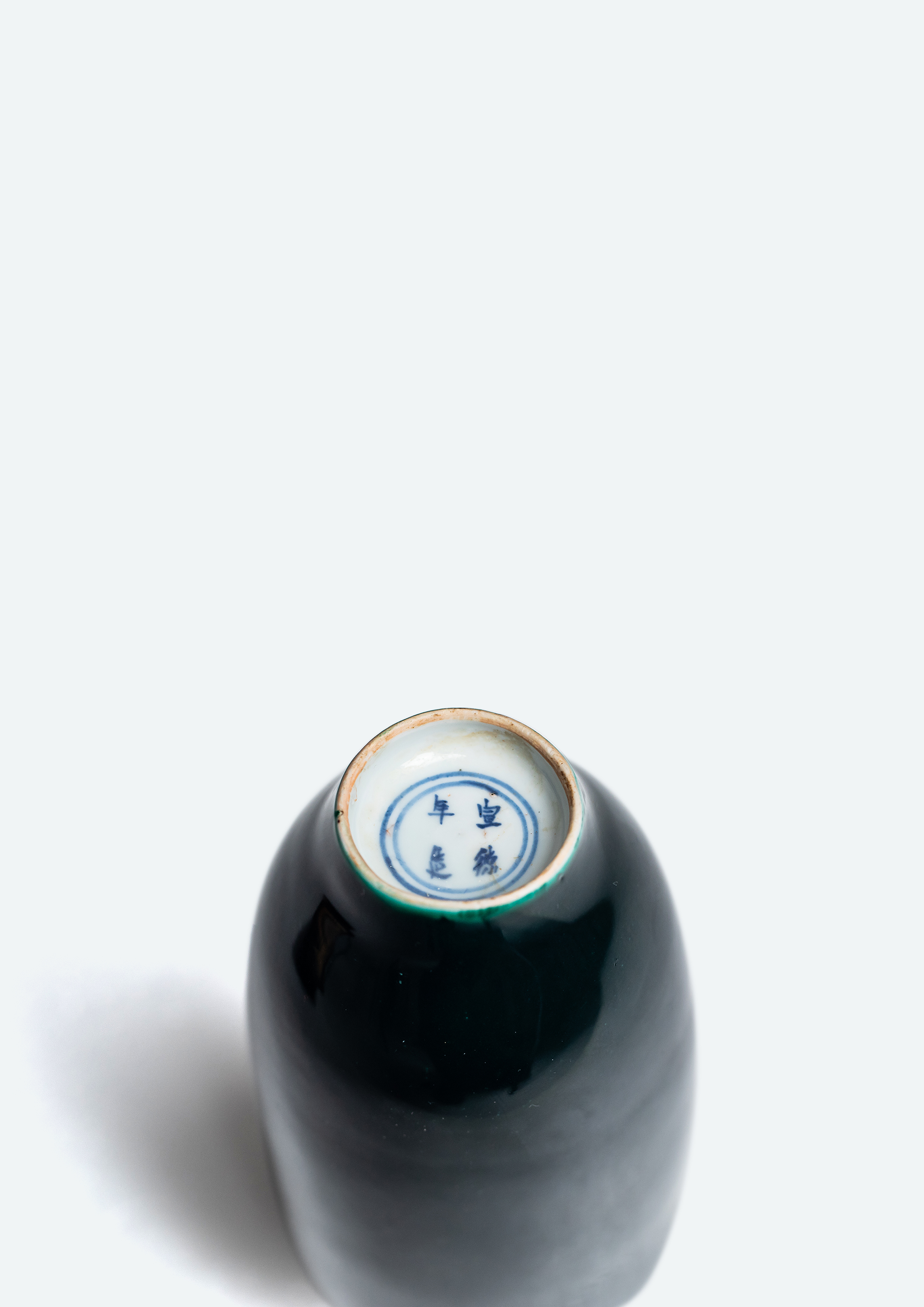 尤為可貴的是,瓶底圈足內露胎處,可見胎質細膩潔白,中心青花雙圈內書“宣德年制”四字雙行楷書款,筆道剛勁,青花發色沉穩,為宣德官窯標準款識,明確標識了其尊貴的宮廷身份。孔雀綠釉器於宣德年間燒造數量極少,存世罕見。此瓶集經典的器型、完美的釉色與確鑿的官窯款識於一身,歷經數百年而保存完好,不僅體現了明代禦窯廠登峰造極的制瓷技藝,亦為宣德顏色釉瓷器之重要實物例證,具有極高的藝術審美價值與歷史收藏價值。