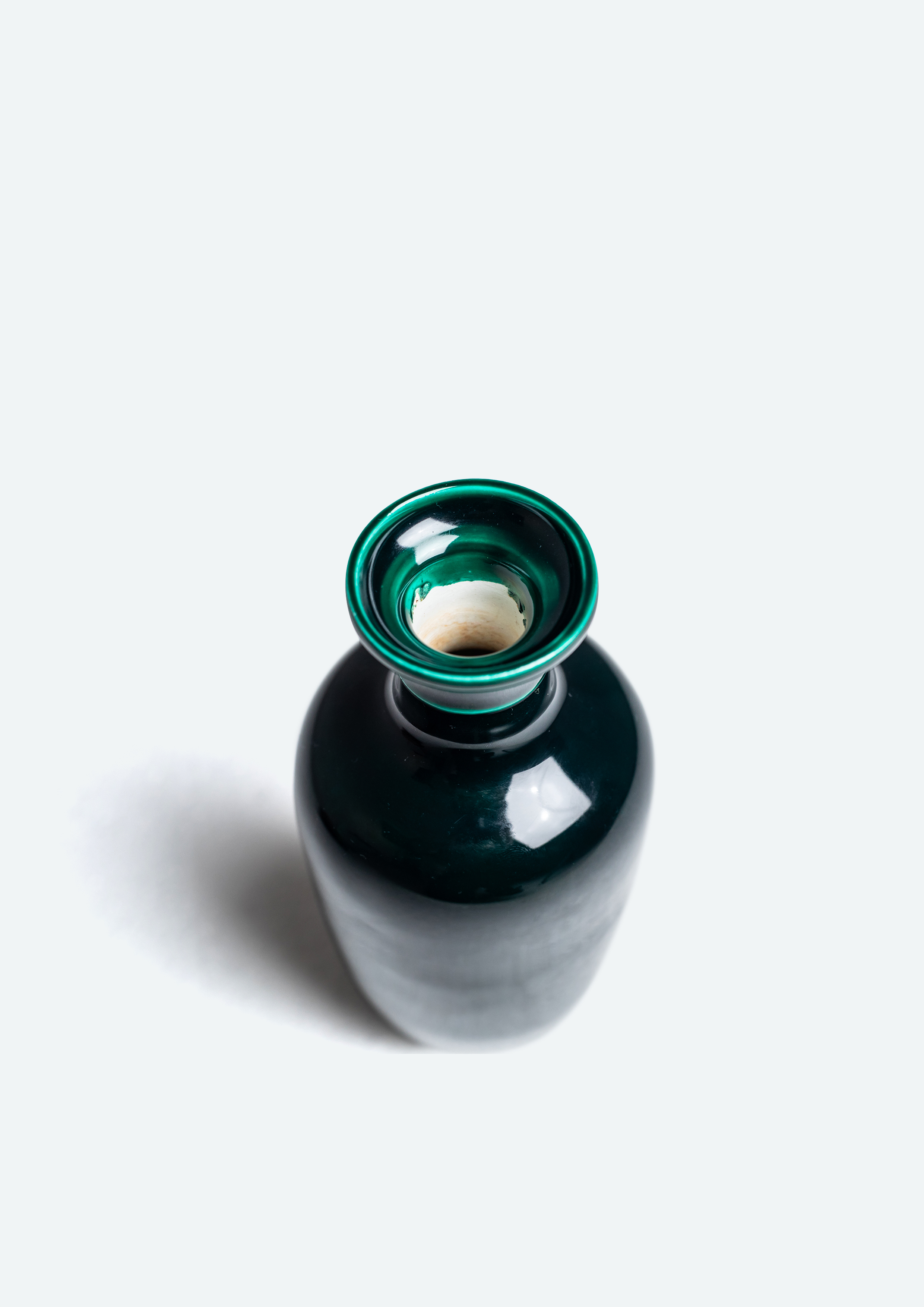 本品為一件明代宣德時期典型的孔雀綠釉盤口瓶,器形端莊秀雅,釉色沉靜華美,堪稱明代單色釉瓷器中的珍罕之作。